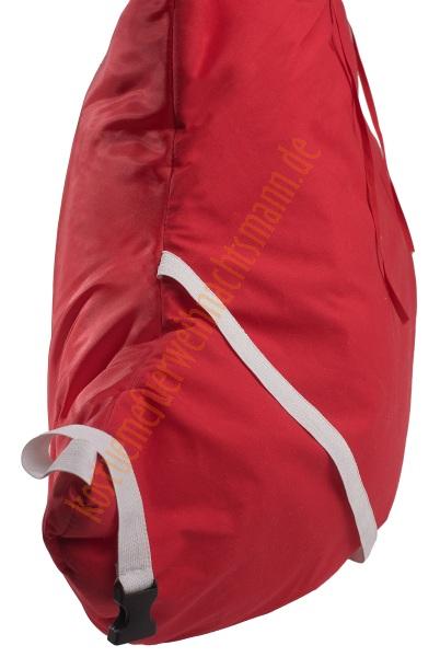 Geschenkesacks. Der rote Geschenkesack aus Drillich hat die Maße 110 x 140 cm, ist reißfest und mit doppelter Naht vernäht, so dass er auch unter größter Belastung nicht versehentlich auseinanderreißt. Der Weihnachtsmann muss keine Angst haben, dass wenn er in Eile ist, evtl. Geschenke verliert, denn das eingenähte Strickbündchen verhindert, dass irgendetwas aus dem Geschenkesack hinausfällt. Bei Verschmutzung kann man die Innenseite nach außen wenden und so den Geschenkesack einfach weiterverwenden.